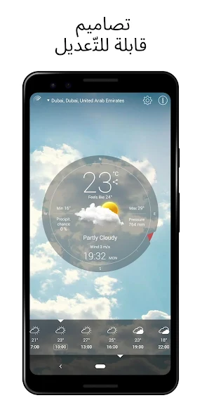 بالإضافة إلى أنه بمقدورك التحقق من حالة الطقس حتى بدون فتح التطبيق. هناك نافذة ظاهرية مرجعية ستكون مدمجة بسهولة على شاشتك. إختر نافذة تفصيلية بحجم كامل أو أبقِ شاشة العرض الرئيسية خاصتك مرتبة قدر الإمكان مع معلومات الطقس الأساسية فقط.